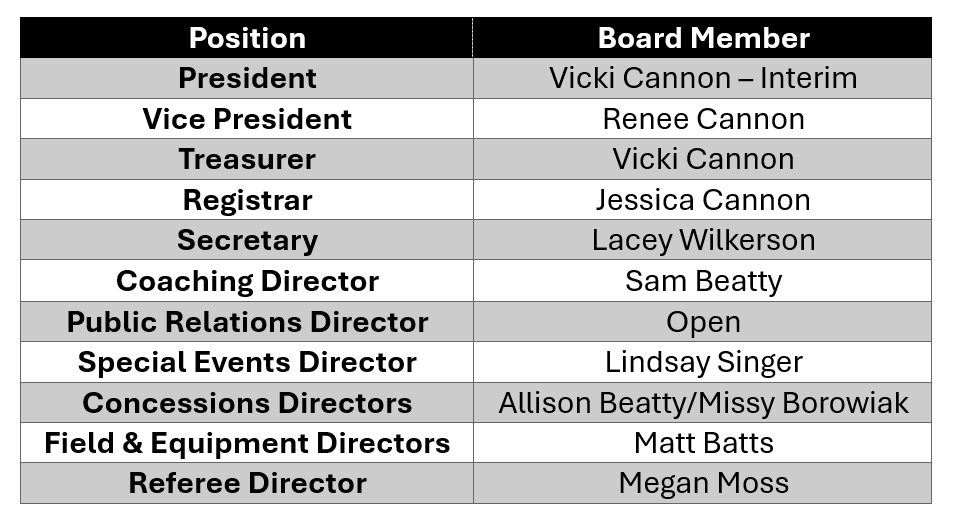 We are a league ran by volunteers, who work full time jobs, miss seeing their child play, miss family events and gatherings. We do this for the love of the sport and for the continued growth of the children we support. If you would like to make a difference like we do, please join us. We would love to have more help and more volunteers even if it isn't in a board position. Your impact can and will go farther than you know.